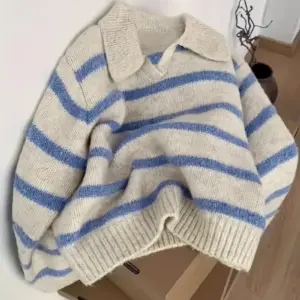 Women’s Fashion Casual POLO Collar Striped Knitted Hoodie Soft and Comfortable Intercolor Sweater