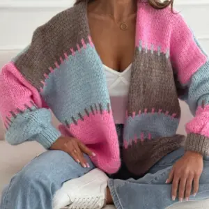 Women’s contrasting casual lantern sleeve cardigan sweater loose soft comfortable knit sweater jacket