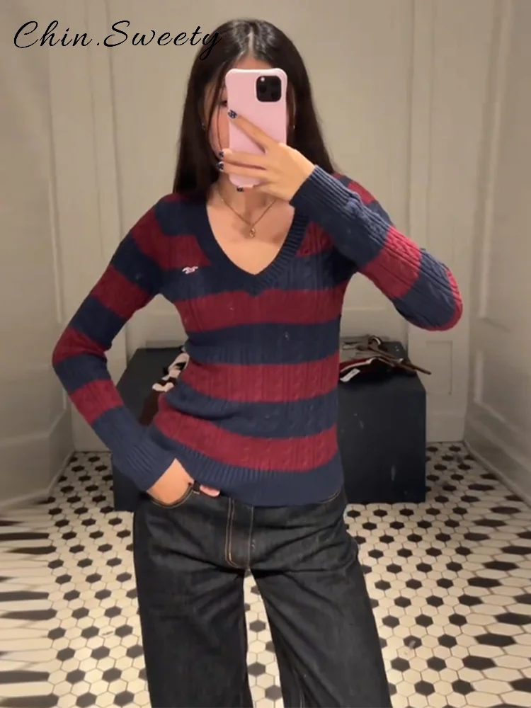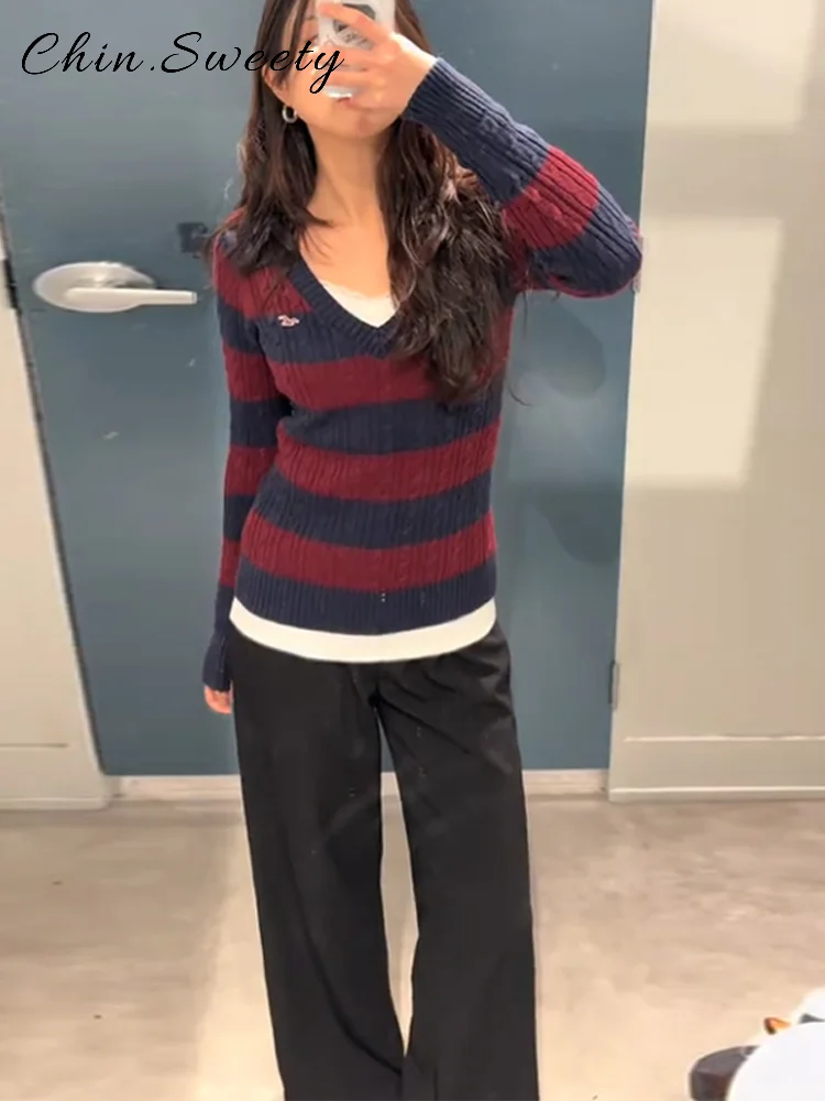 Casual Women’s Striped Knitted Sweater V-neck Full Sleeve Slim All-match Pullover Female 2026 Spring Lady Chic Commute Knitwears