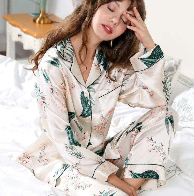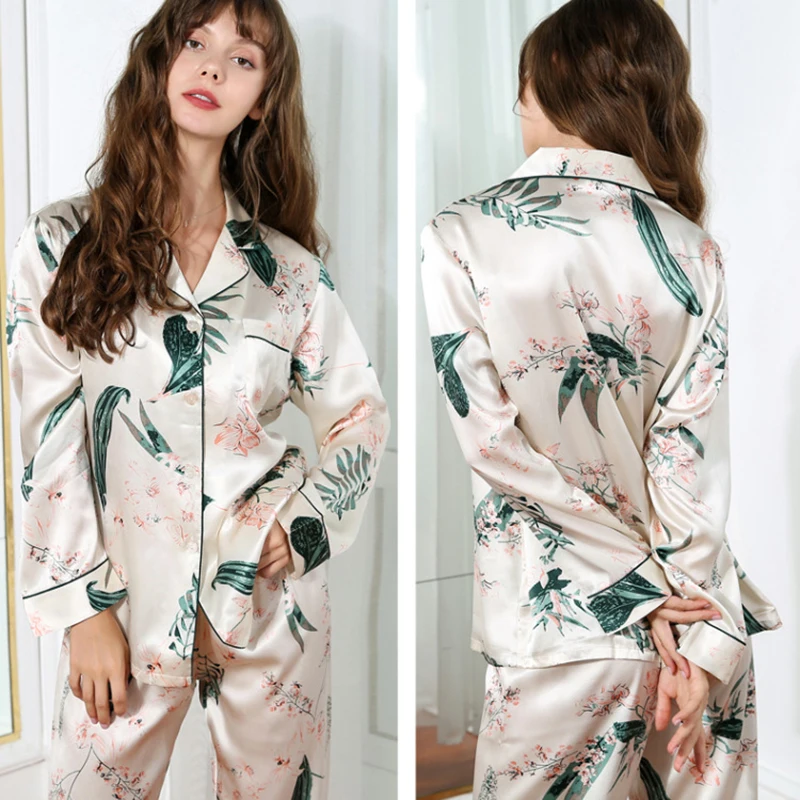 Real Silk Pajama 100% Silk Sleepwear Thin Summer Long-Sleeve Two-Piece SILK Woman’s Sets Female Fashion Printed