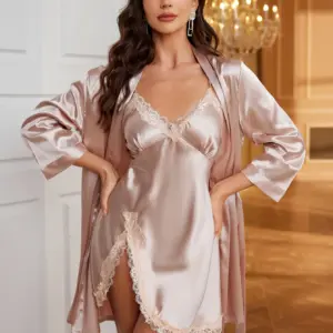 Women’s Four Seasons Home Furnishing Lace Up Pajama Pajama Dresses Two Piece Set Thin Outerwear Medium Length Pajama Set