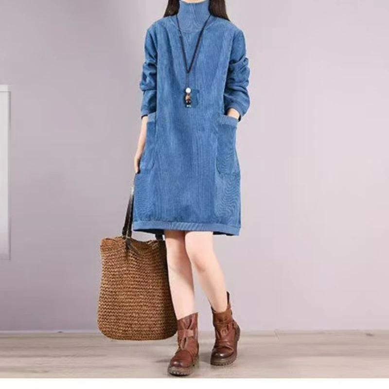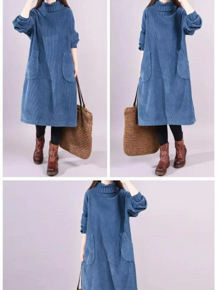 Women Autumn Winter Dress New Retro Corduroy Vestidos Add Velvet High Neck Dress Mid-Length Loose Pullover Sweater Female 2025
