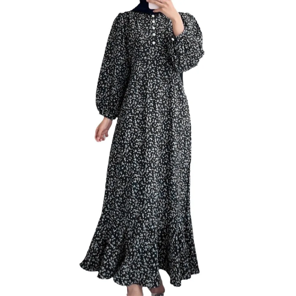 Women Fashion Loose Printed Long Sleeve O Neck Muslim Abaya Dress Vintage Ruffles Hem Sundress Robe Femme Turkey Vestido Kaftan