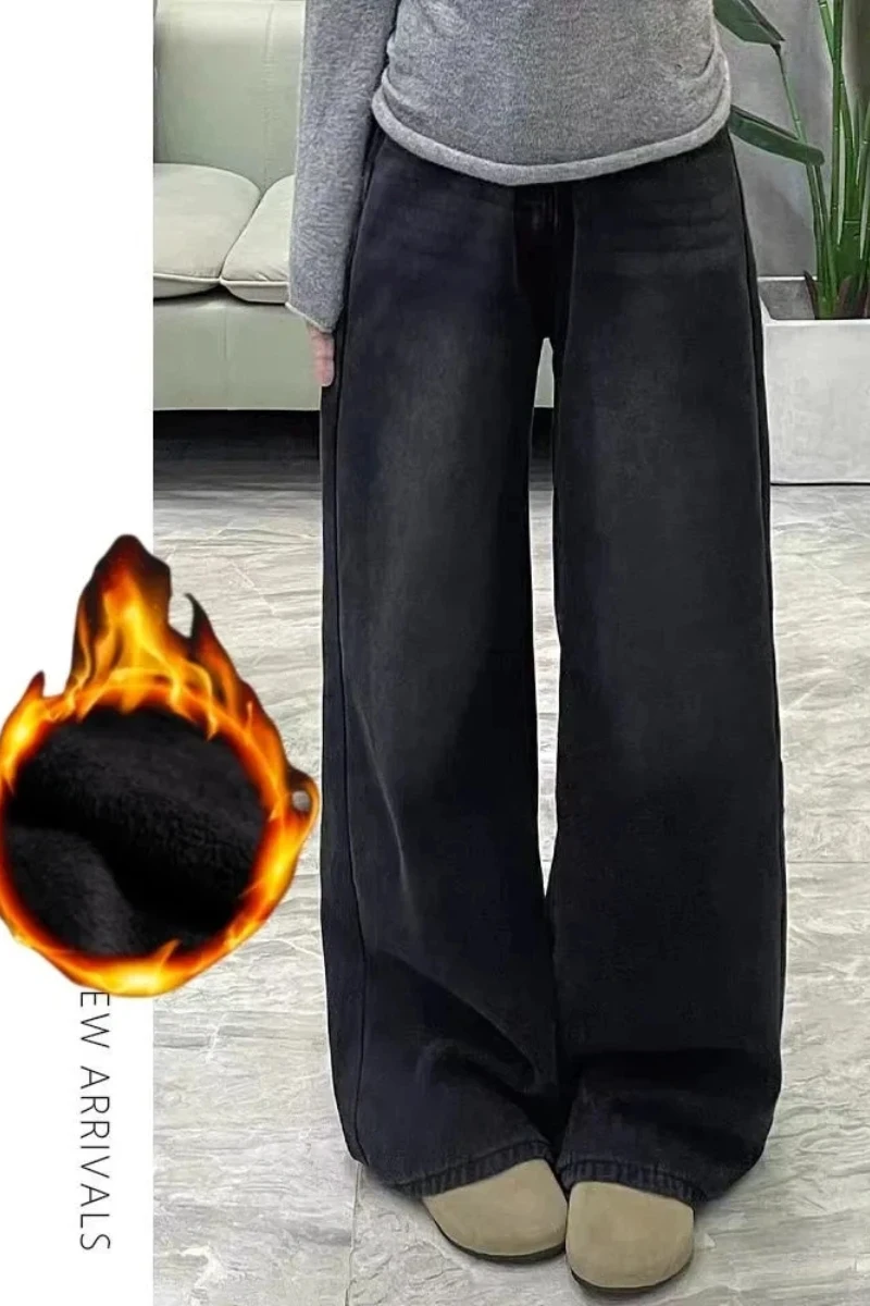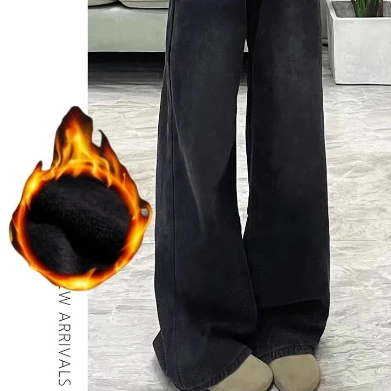 Y2k Pants Jeans for Woman Winter Fleece Lined 2025 New Thick Warmth Slim Wide Leg Straight Trousers Fashion casual